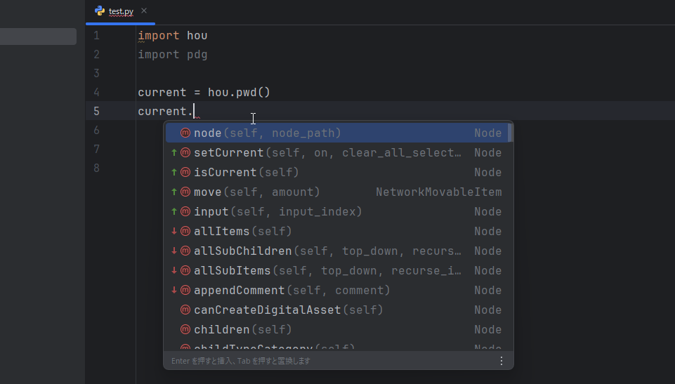 型ヒントを読み込み、hou.pwdなどの返り値がNode型としてして認識される