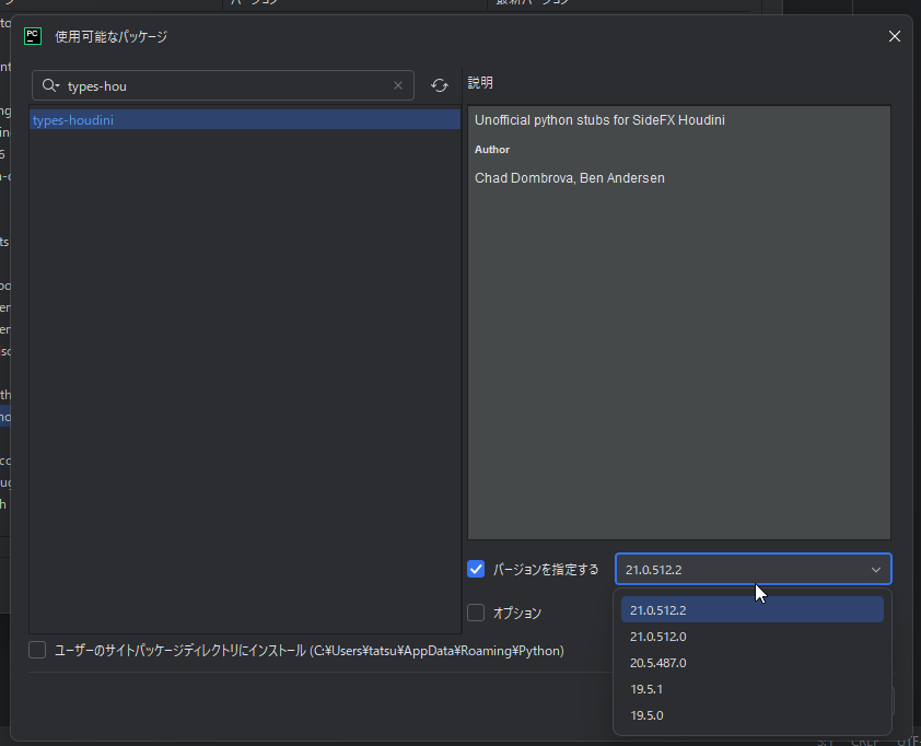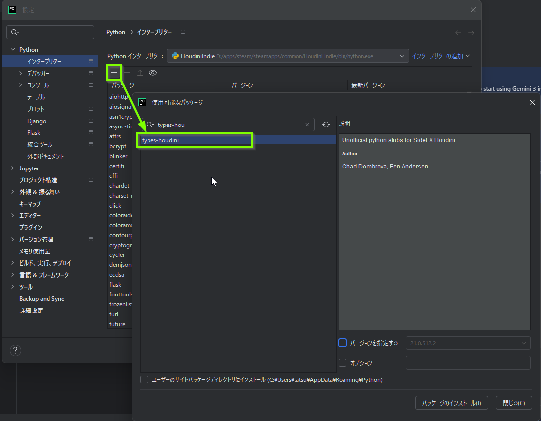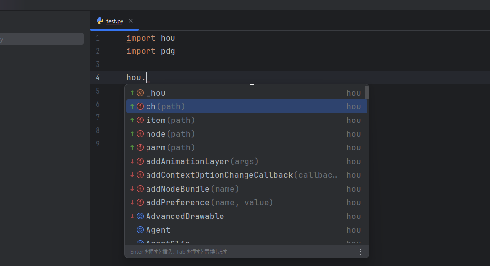 SideFXが提供しているHoudini環境は丁寧に環境準備の対応をしてくれており、インタプリタを設定するとそれ用のパッケージにパスが通りオートコンプリートが有効になる。