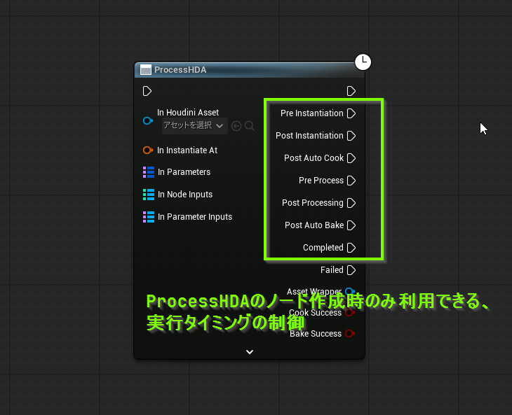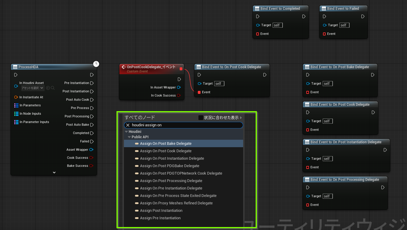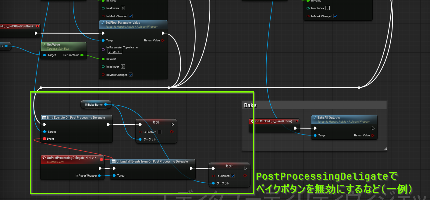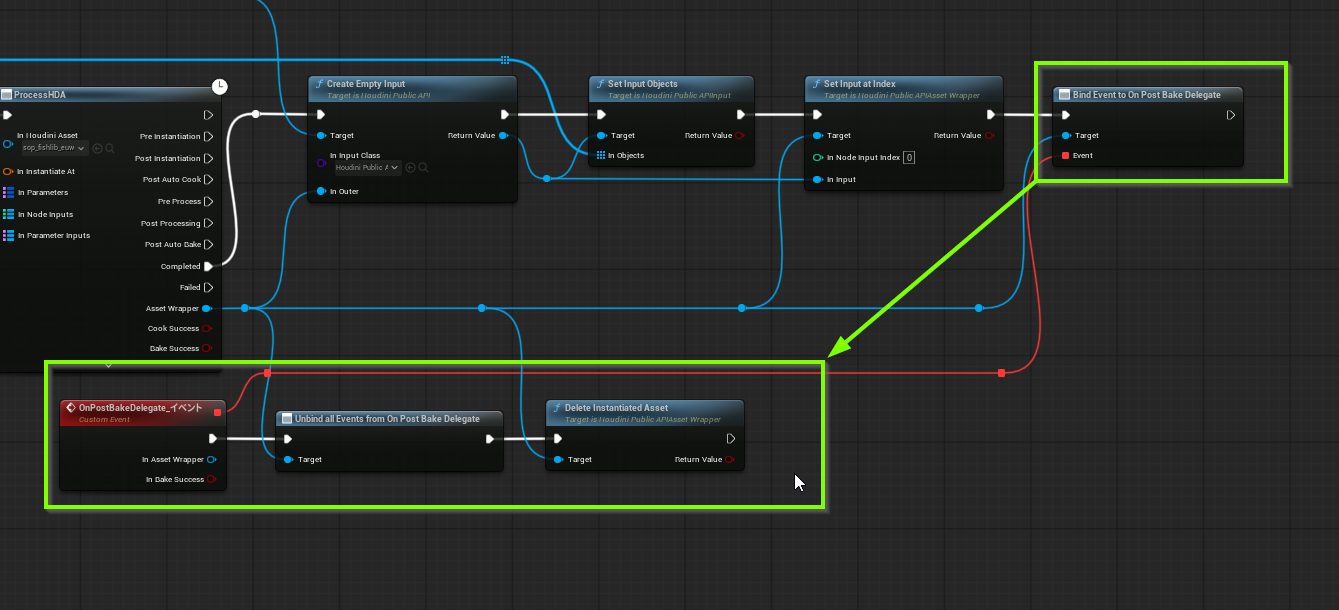 ※「OnPostCookDelegate」と「OnPostProcessingDelegate」があるが、OnPostCookDelegateはHoudiniの内部の処理完了待機のみで、OnPostProcessingDelegateがUnrealEngineに結果を反映させた後に待機が完了する処理。この例の場合、次の工程の処理はUnrealEngine上なのでOnPostProcessingDelegateを使っている。
